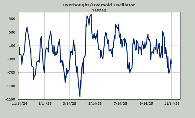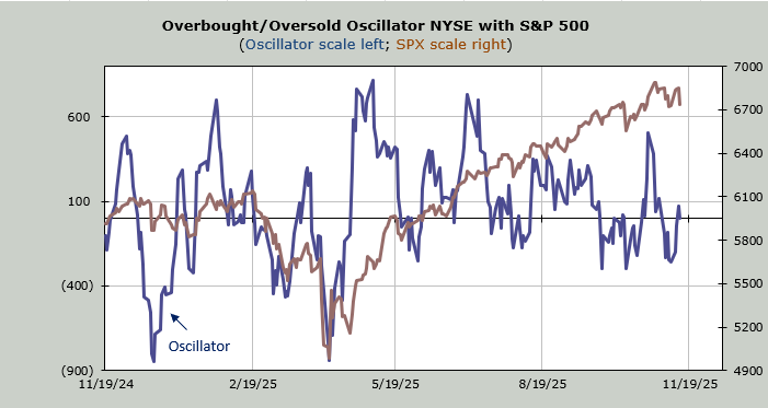 Now, when you look at the Overbought/Oversold Oscillator, you may wonder, why wasn’t it down more after Thursday’s action? Because the 493 are still a bit oversold. Or at least not overbought yet. You might have noticed there wasn’t much selling outside of the tech names, which we have discussed (perhaps too much!), and the financials, which have been strong. Most of the other stocks were down a bit. Or flat.