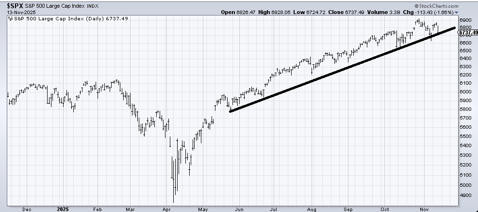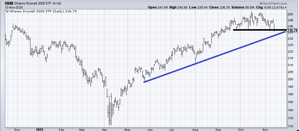 There is another line I suspect folks will be focused on. It’s on the chart of the Russell 2000. We’ll use the ETF IWM to show it. It’s flat and it has held since the late September sell-off. And while we’re not talking about an uptrend line here, we do have a failing rally in place from late October. The first support after breaking that line—should it happen—would be at the blue line.