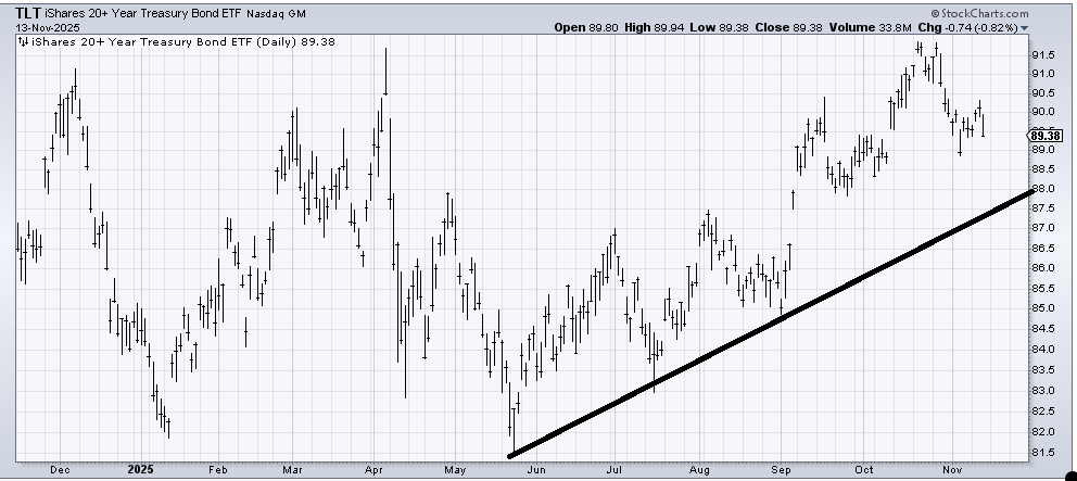Finally, there are the bonds. I still don’t have a strong view on them (except that I did not and still don’t think TLT will get over 92 for the time being). But there is a head and shoulders pattern developing (albeit with an upslanting neckline). For now, I think that uptrend line area (87-ish) is likely to hold, but I see chatter has changed drastically from a gazillion rate cuts coming our way to ‘oh maybe no cut in December’.