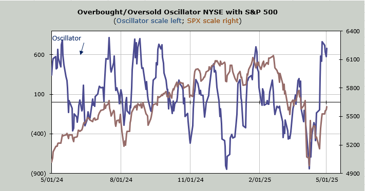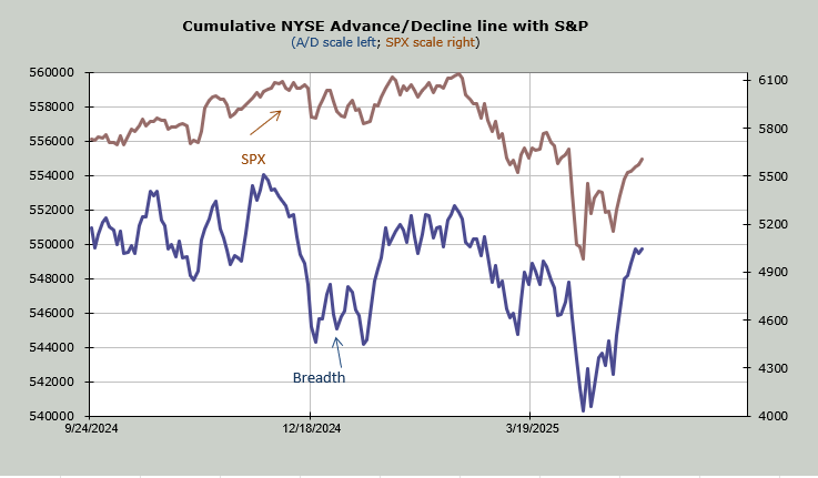 I have noted breadth has been good; notice that the blue line (breadth) is higher than it was in mid-March. That is bullish. Notice the S&P (brown) is not yet at that mid-March high. So breadth has been outperforming. But now notice the last two days (you need to squint), breadth has stalled out while the S&P has kept on going.