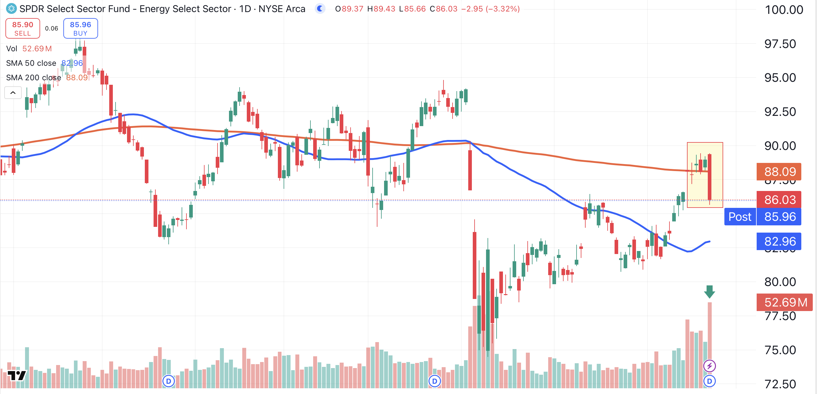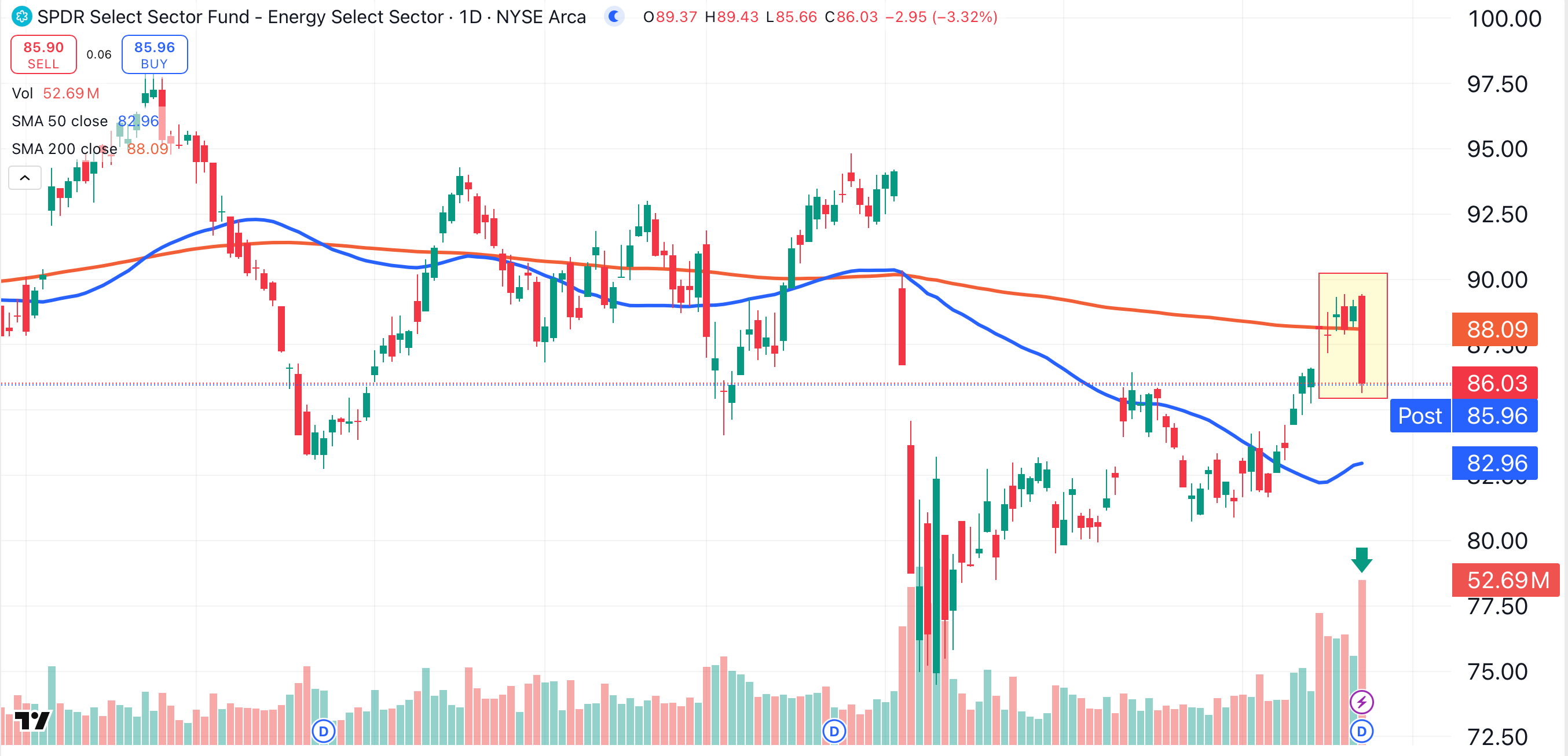 That same pattern is visible in the SPDR Energy Sector ETF XLE. This bellwether for the industry has also formed a large bearish engulfing candle (shaded yellow). XLE fell below its 200-day moving average (red) on its highest volume in months (green arrow).