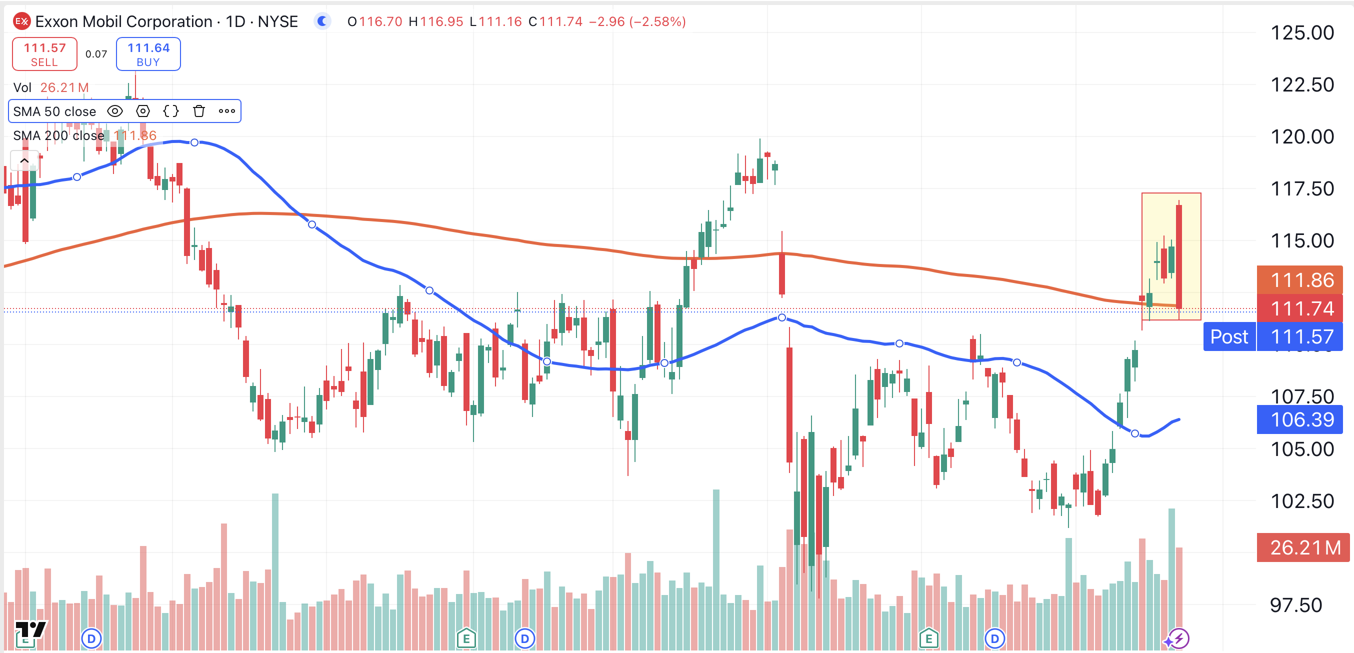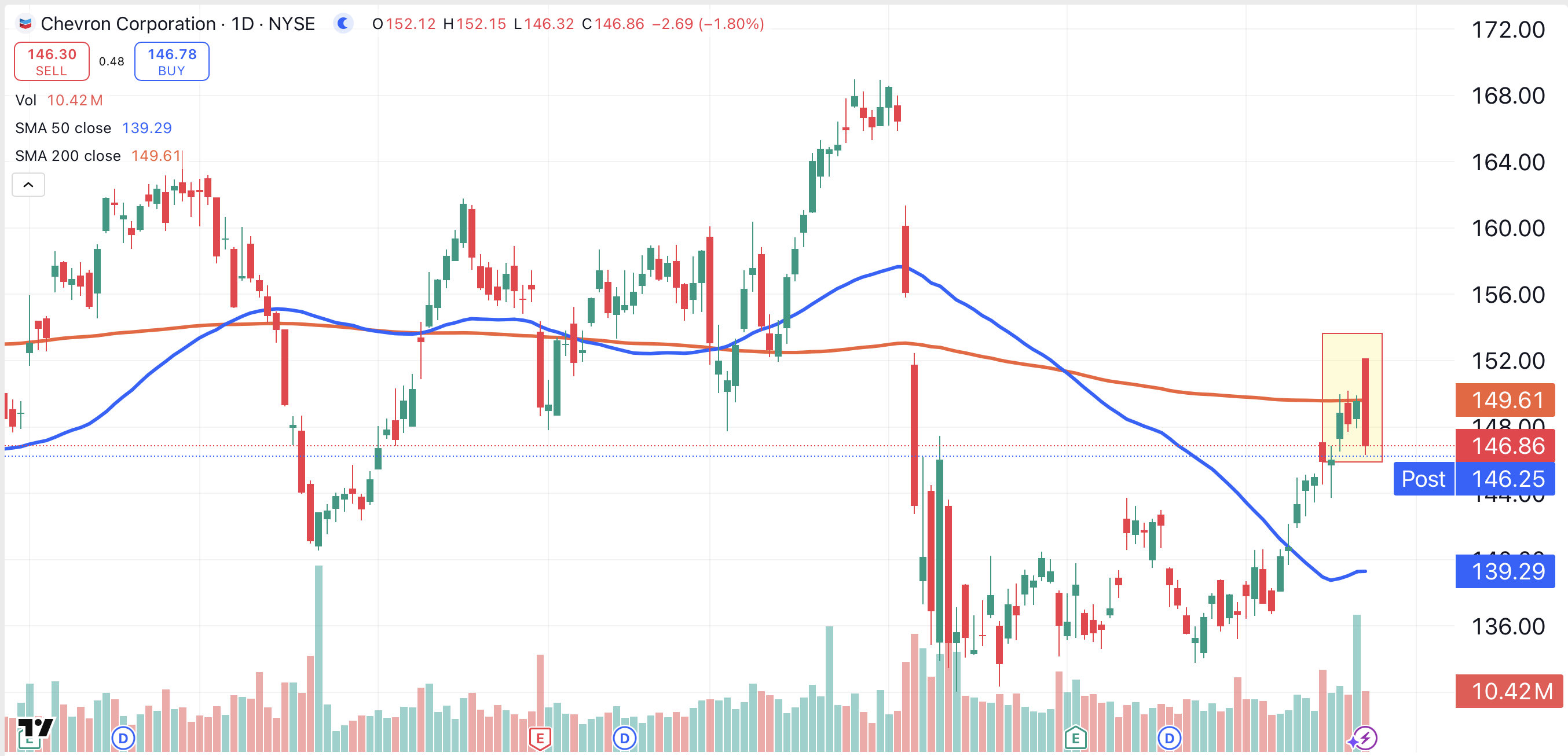 Chevron Corp. CVX fell by 1.8% on Monday, while forming the same bearish candlestick pattern (shaded yellow). Unlike Exxon Mobil, Chevron failed to hold above its 200-day moving average.