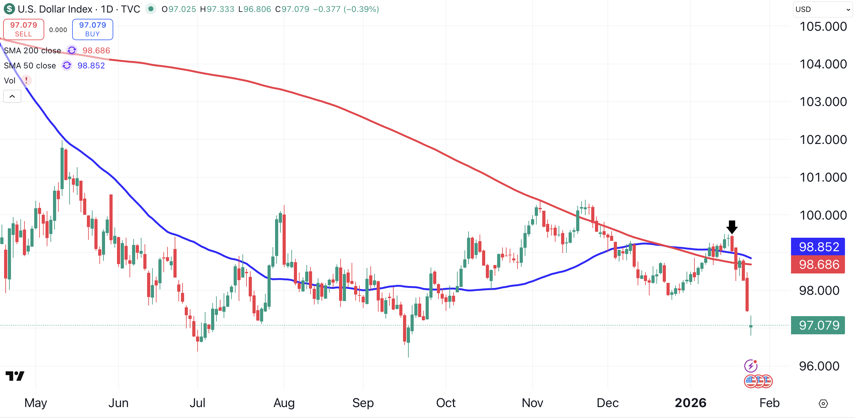 Here is the U.S. Dollar Index (DXY), showing the dollar falling rapidly against a basket of currencies. Note the acceleration of the decline over the past week (arrow).