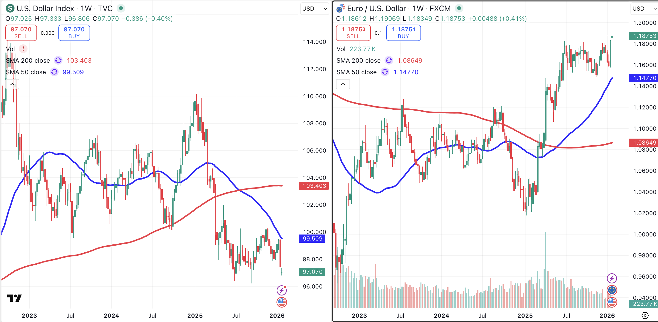 If we are measuring the dollar against other currencies (as in the above example), then a weaker dollar equates to stronger foreign currencies. This is clearly visible in the comparison between the dollar (left chart) and the euro (right chart).