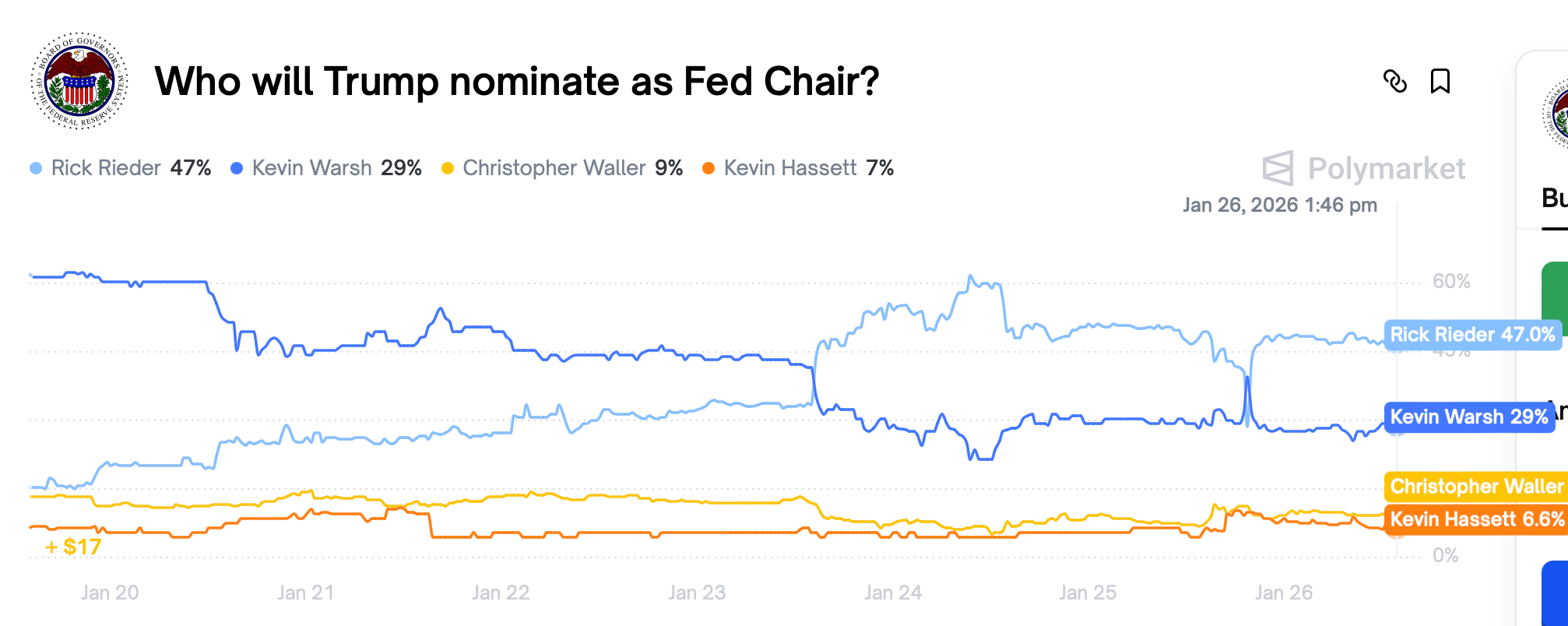 Over the past week, BlackRock executive Rick Rieder has surged into the lead as the likely nominee for Federal Reserve chair. Prediction market Polymarket shows the odds of Rieder’s ascent jumping from 16% on January 20 to 47% on January 27.