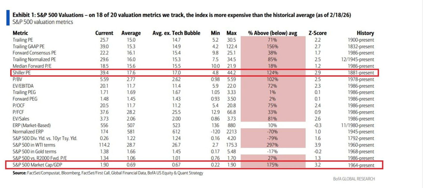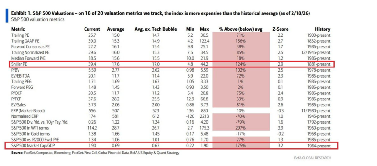 * The equity risk premium has become, for the first time in almost three decades, an equity risk discount. Historically, this is an indicator that current valuations provide a poor launching pad for future returns. It also means that investors believe there is more risk in owning bonds than stocks — truly a foolish (and dangerous) notion. From a valuation standpoint stocks remain somewhere between highly overvalued and pornographically overvalued. Most traditional valuation metrics support this view: