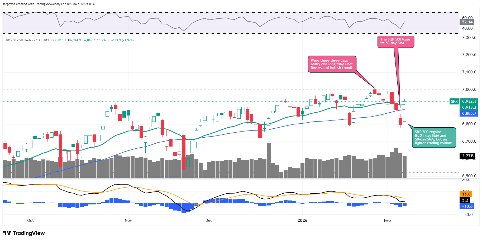 ​Note that as the S&P 500 sold off throughout the week, that even though in hindsight, we can label last Wednesday as a bearish "Day One" reversal of trend, that there never really was a necessary "pause" until Friday, and that trading volume ebbed throughout the balance of the week.