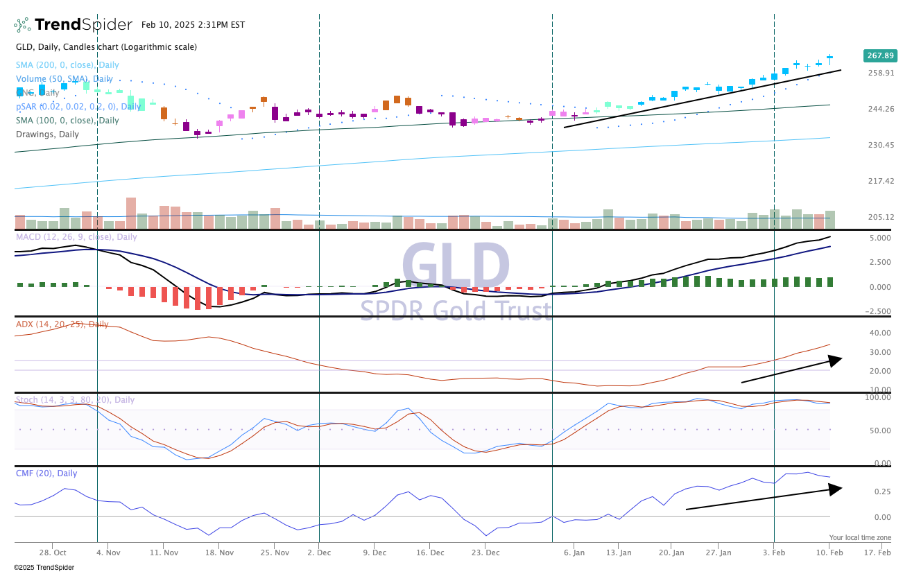The chart shows amazing strength, dips being bought each time. MACD (moving average, convergence/divergence) is overbought, and money flow is elevated. However, that does not mean to short or sell the ETF, rather to wait for your opportunity. The price action is bullish and confirmed by the ADX in pane 3. When the ADX is above 25 the trend is uber strong.