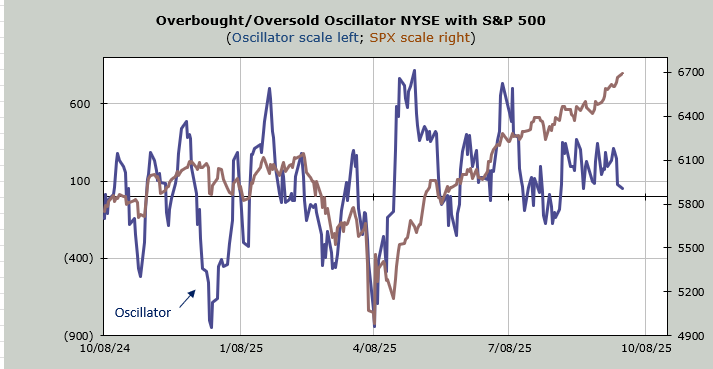 In any event, the indicators did not change on Monday. Breadth was better than Friday in that the net breadth was flat, whereas Friday it was downright negative. The number of stocks making new lows remains high, while new highs are nothing to write home about.