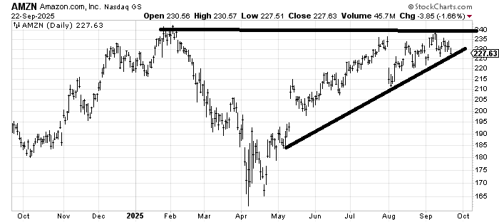 Meta, Google, and Amazon were all down on Monday. Is a rally in NVDIA now sucking the life out of them, not just the 493? Amazon has yet to make a higher high than February and now sits smack on an uptrend line. Maybe tomorrow it will get saved and become the stock of the day, but I find it curious no one gets excited over this stock anymore. They must have some AI thing they can talk about!