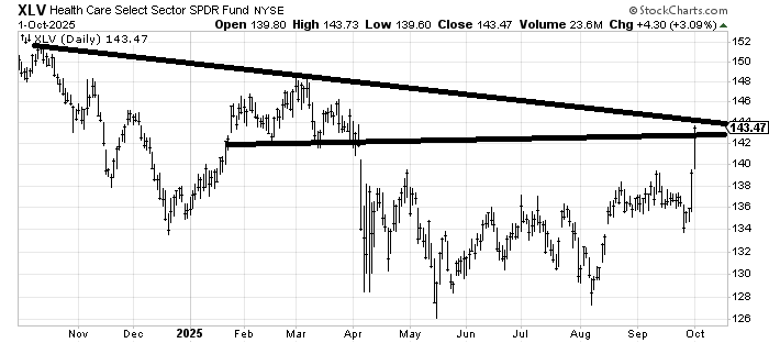 But this is exactly what I mean by group rotation. The chart of XLV has rallied right back to resistance. I have said that I thought it was basing because if you had put your hand over the left side of the chart, you can imagine by the time 2026 rolls around, that will fall off a one-year chart and will therefore look like a big base. So yes, I still like drugs, but no, I am not chasing them here. There is a target in the 150-155 area.