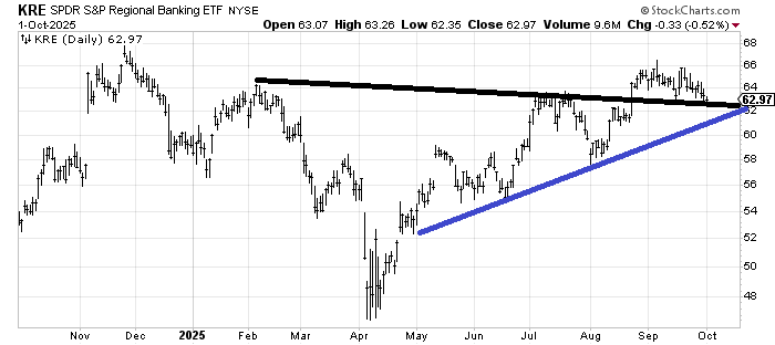 But we need to go back to the banks, specifically the regional banks. They haven’t broken, but they have been awfully droopy. Two weeks ago, when KRE fell to this area, I said I thought we should see a bounce. But I also noted that the key was that it needed to make a new high. It did not. Now it finds itself back at the line. If this line doesn’t hold, it’s not the end of the world, but then the blue line comes into play, but it leaves resistance overhead. I suspect we see that blue line tagged over the next few weeks.