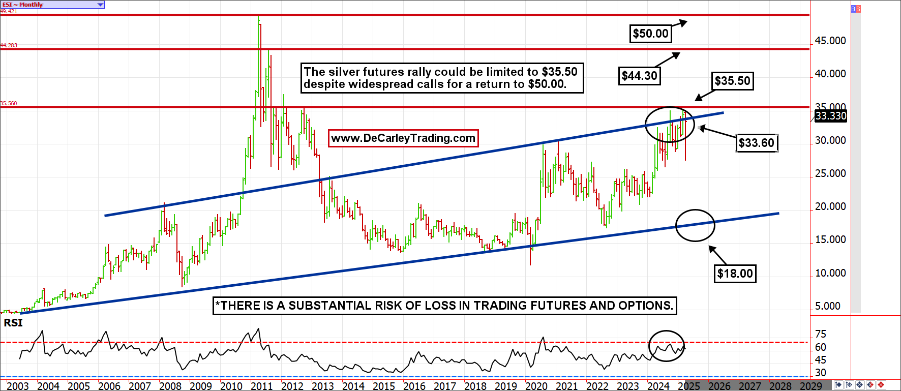 Since the 2011 high of $50.00, buy-and-holders have likely suffered emotionally and financially. I suspect active traders haven’t fared any better, due to the stop-and-lurch nature of price action. In silver, it is easy to get caught in the wrong place at the wrong time. Even so, this is a market that many traders follow and inquire about, so we are compelled to share the latest monthly chart.