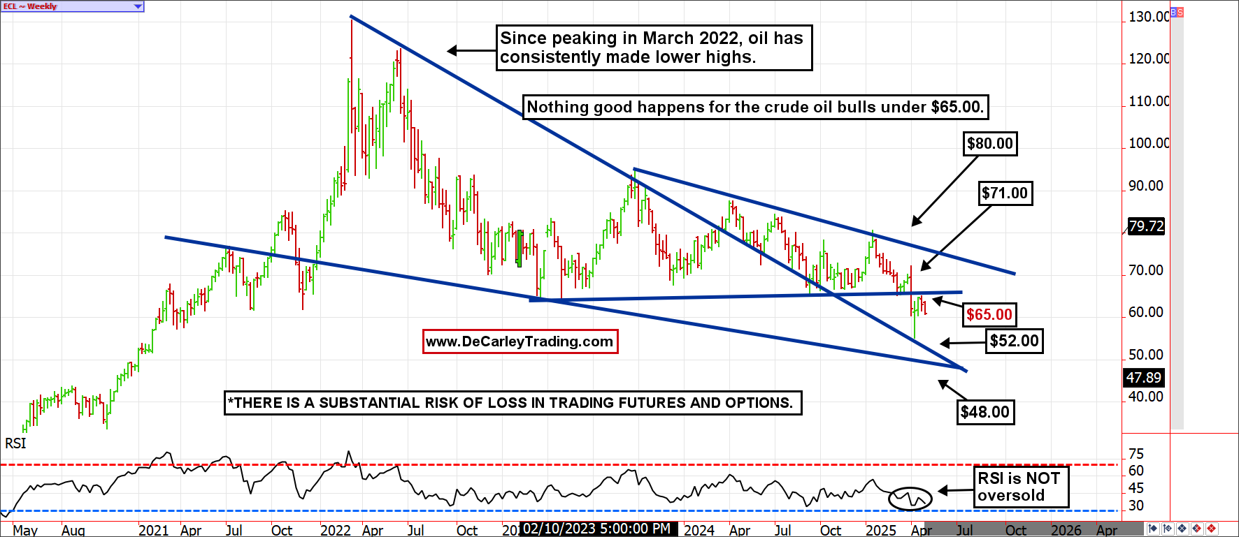 The oil market consistently found buyers near the $65.00 level for over two years until it didn’t. If we are right about the bear market continuation, the previously supportive level ($65) should be the new ceiling with $52.00 as a potential downside target, and perhaps even $48 is in play if selling gets out of hand. We admittedly still have PTSD from the 2014 and the 2020 oil sell-offs. In both instances, the market traded with low volatility and stable pricing for a few years before falling off a cliff. If we repeat that pattern, this sell-off isn’t done yet.