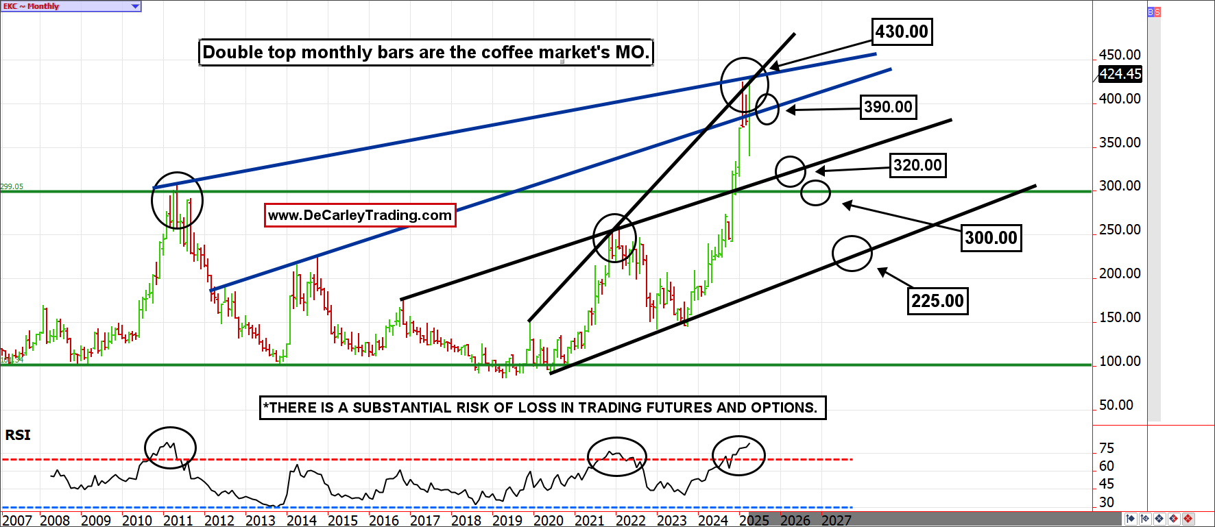 At the moment, market participants are doing a lot of guesswork to determine how this grinds out (pun intended). Still, the U.S. administration seems to be offering relief to products that cannot be produced in the U.S. Due to the climate needs for growing coffee beans, it seems to fit into that category. Yet, we don’t know until we know, which is stressful and hectic. But we know how the market has behaved in the past. Coffee has habitually posted two monthly bar extensions with the RSI in overbought territory before rolling over. This time is rarely different, but it always feels like it is in real-time.