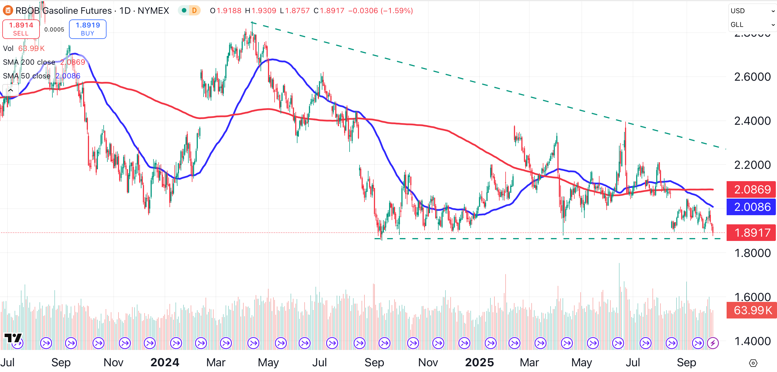 The decline in crude is weighing on RBOB gasoline futures, which have formed a huge descending triangle pattern (dotted lines). Major support here is 1.8545, a low point from early September of last year (arrow).