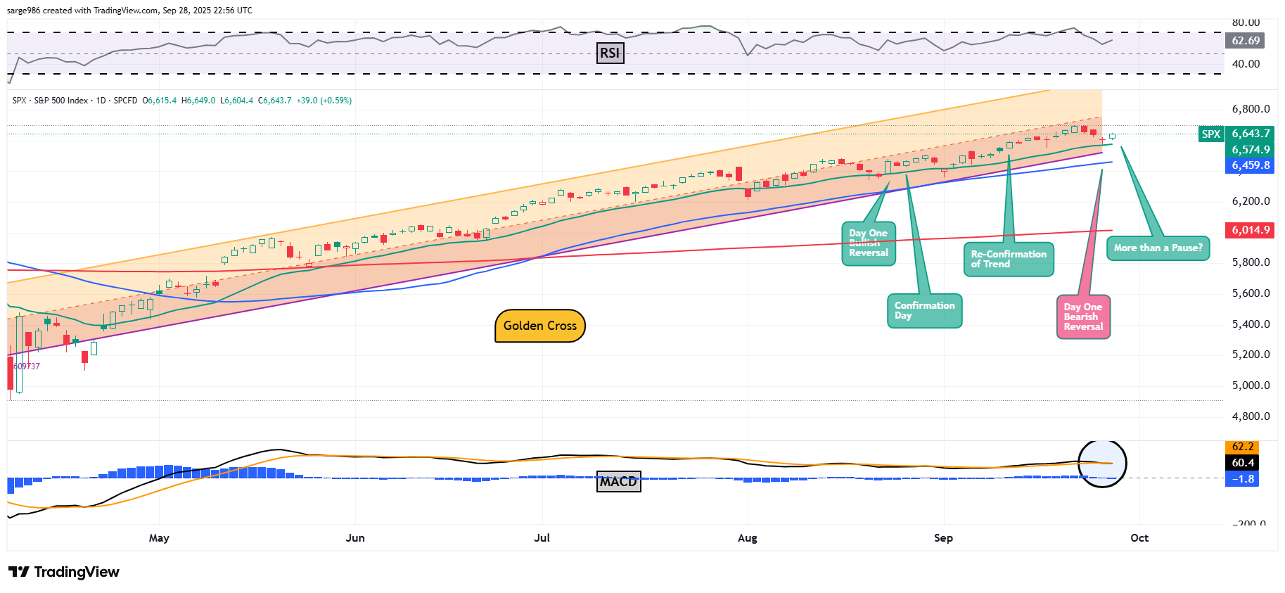Now, what to make of Friday. No, Friday was not a Day One bullish reversal. While the rally was quite broad and quite robust, it was not supported by increased trading volume. Not even close. Trade on a day over day basis was 13.1% lighter across NYSE-listed names and down 14.8% across Nasdaq-listings. But the rally on Friday still took out the Thursday high and the close on Wednesday. Does that price discovery on Friday negate the Day One bearish reversal last week? It really might. What's difficult to discern is what impact the possibility of a government shutdown this week and the labor market data expected this Friday are having on financial markets. I hate to do this to you, but we're in limbo in a way until we see some new activity and how developing news impacts the flow of capital.