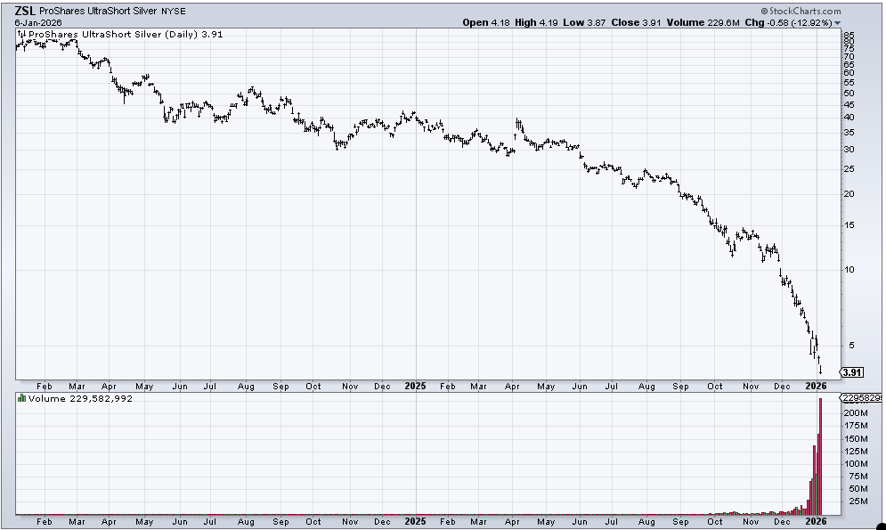 Anecdotally, I posted this chart on social media today, and folks came out of the woodwork to explain why it is actually bullish that we’re seeing this sort of volume in a short ETF. The most plausible explanation is that it’s a ‘cheap’ way to hedge their long silver positions. They may be correct, but the same way I knew all that speculation in the penny stocks back in September and October was too much of a good thing, I know this is as well. I would say if this short ETF does a reverse split, run for the hills because that is often the kiss of death.