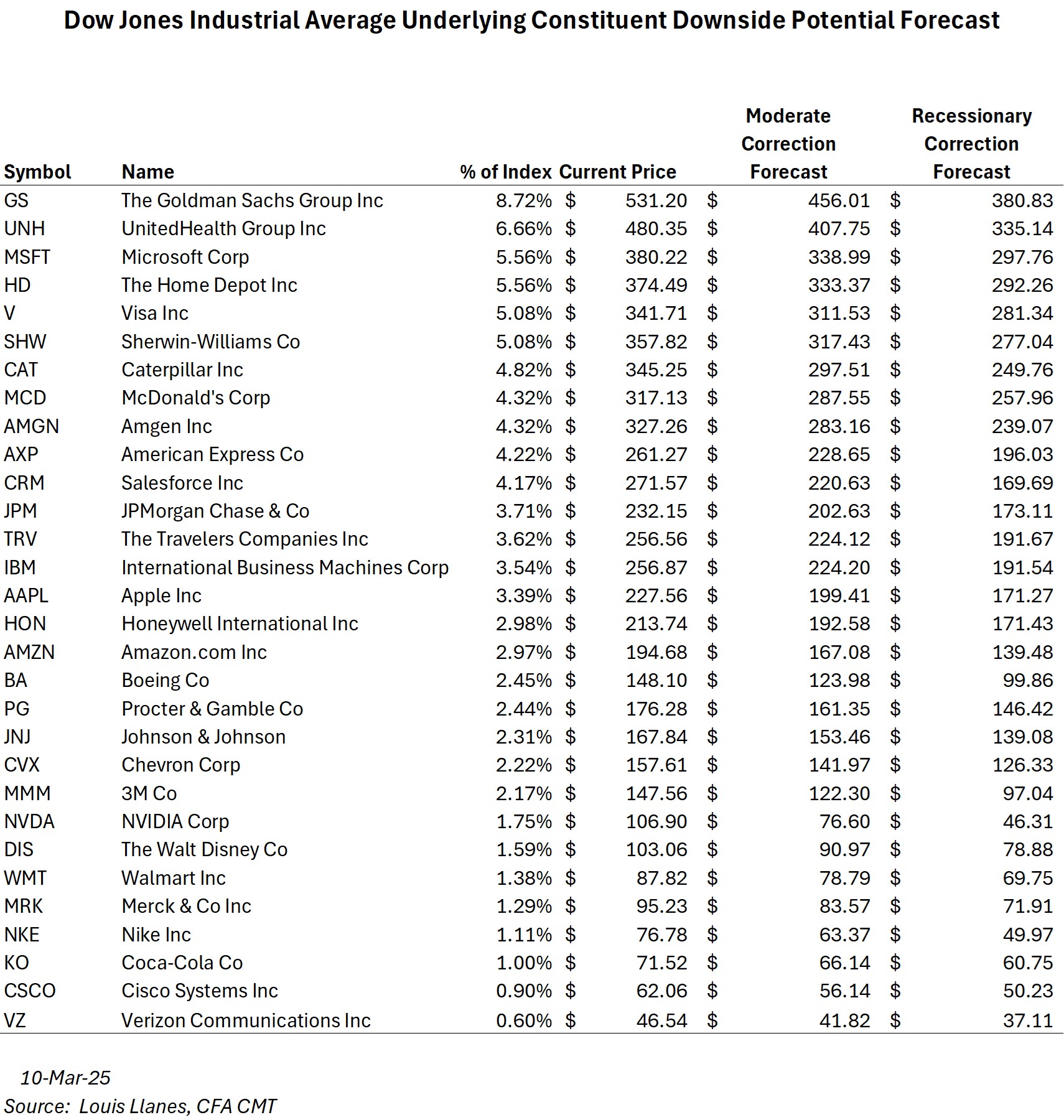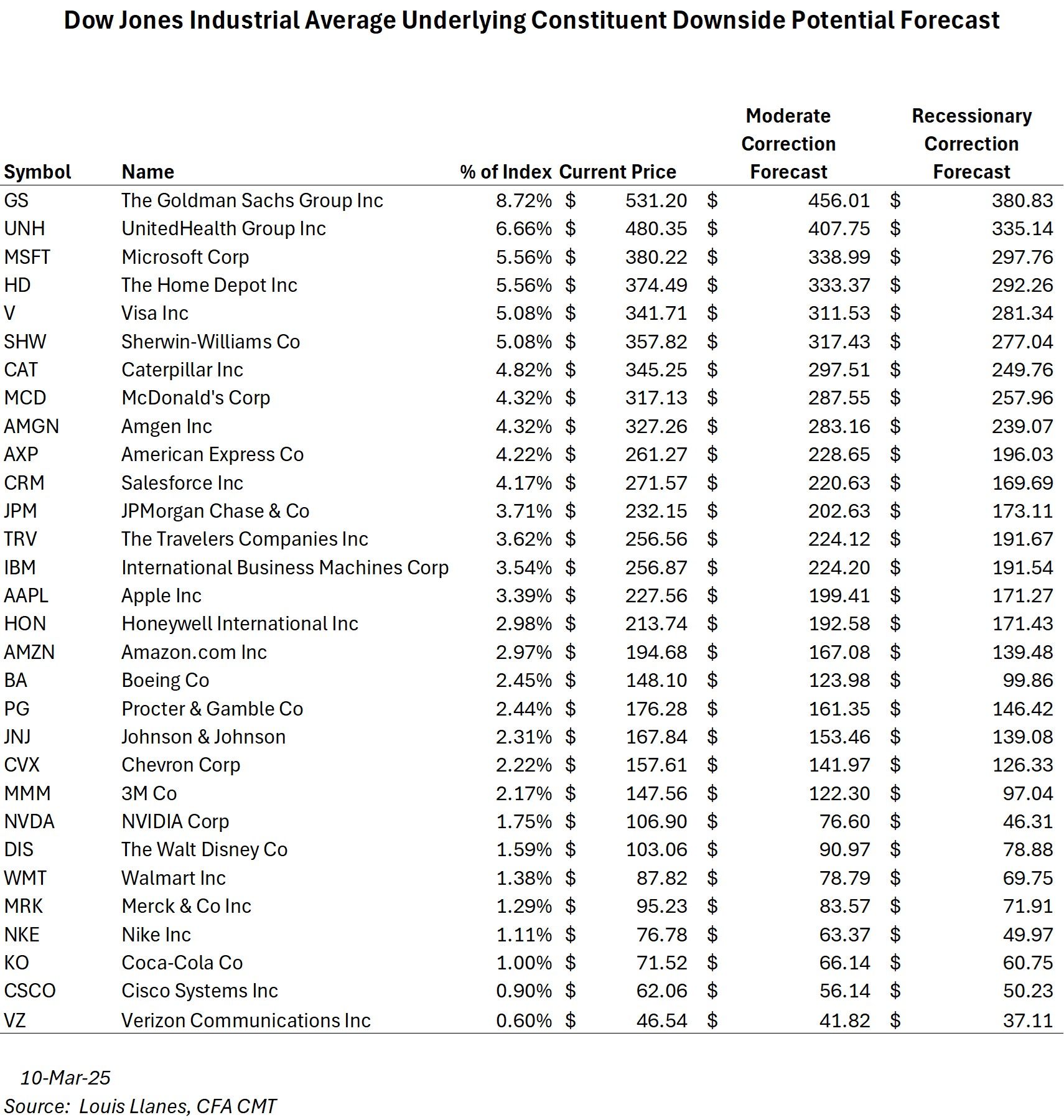 Now to get to the bottom line putting it all together. To forecast the downside risk, using daily volatility, support and resistance levels, and fundamental conditions, I calculated downside targets for each Dow stock under two scenarios:
