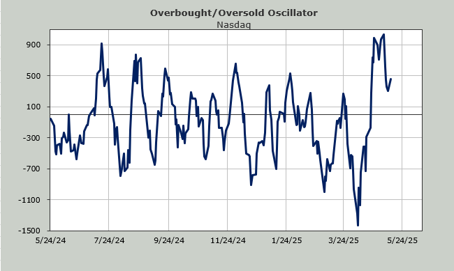 And then there is the VIX. The DSI for the VIX is now a teenager at 19. As a reminder, under 15 (or over 85) and it’s a yellow flag, and single digits (or over 90) it’s a red flag. If the VIX falls much more in the next week or so (heading into that overbought condition) and the DSI on the VIX is under 15, then we’ll know sentiment has changed enough that we should expect volatility to come back in June.