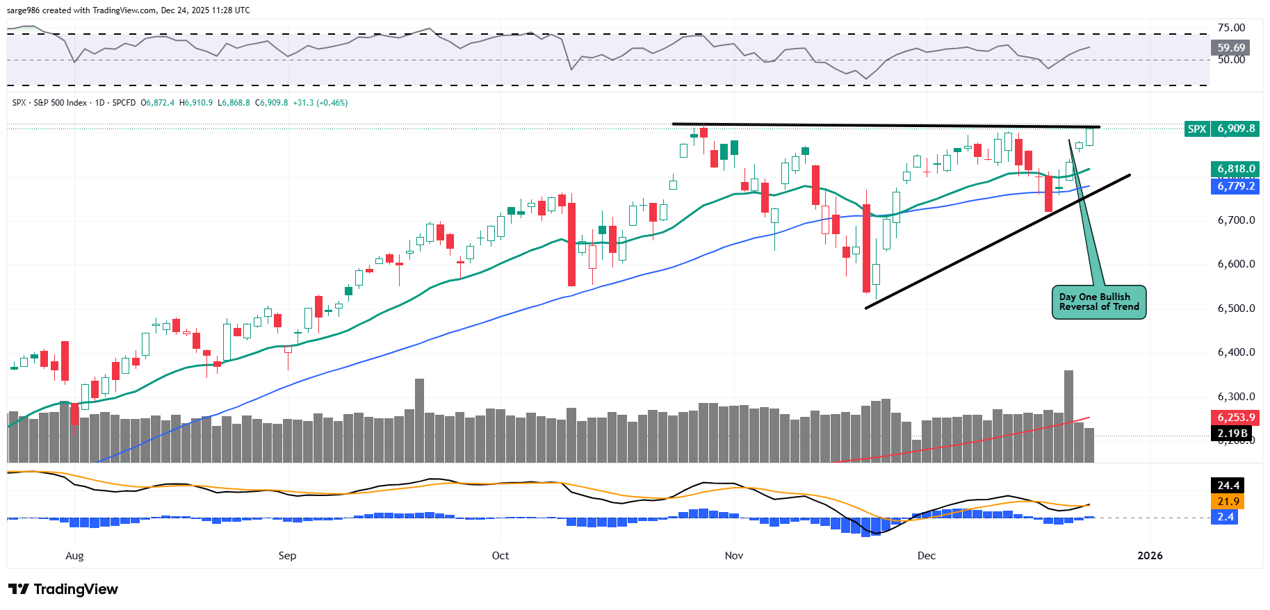 We have an ascending triangle ​pattern of bullish trend continuance on our hands, don't we, gang? The pivot stands at 6,903. The S&P 500 closed last night at 6,909. Folks, we get a take and hold at this level and Santa may just be in business. Ho, Ho, Ho!
