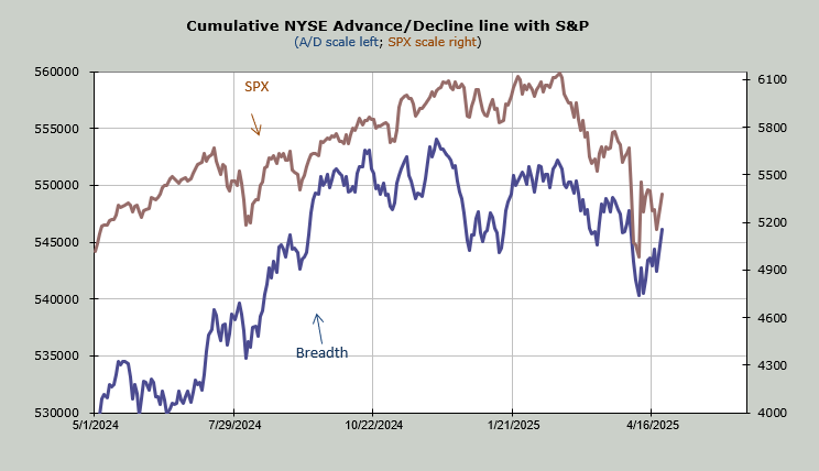 What we are looking at is the net of the breadth on the NYSE (advancers minus decliners). As we headed into this week, we were set to drop all those big red numbers from just after Liberation Day. I noted that I thought we should see the Oscillator get up and over the zero line. And it has. In a big way. It is almost back to where it was in late January.