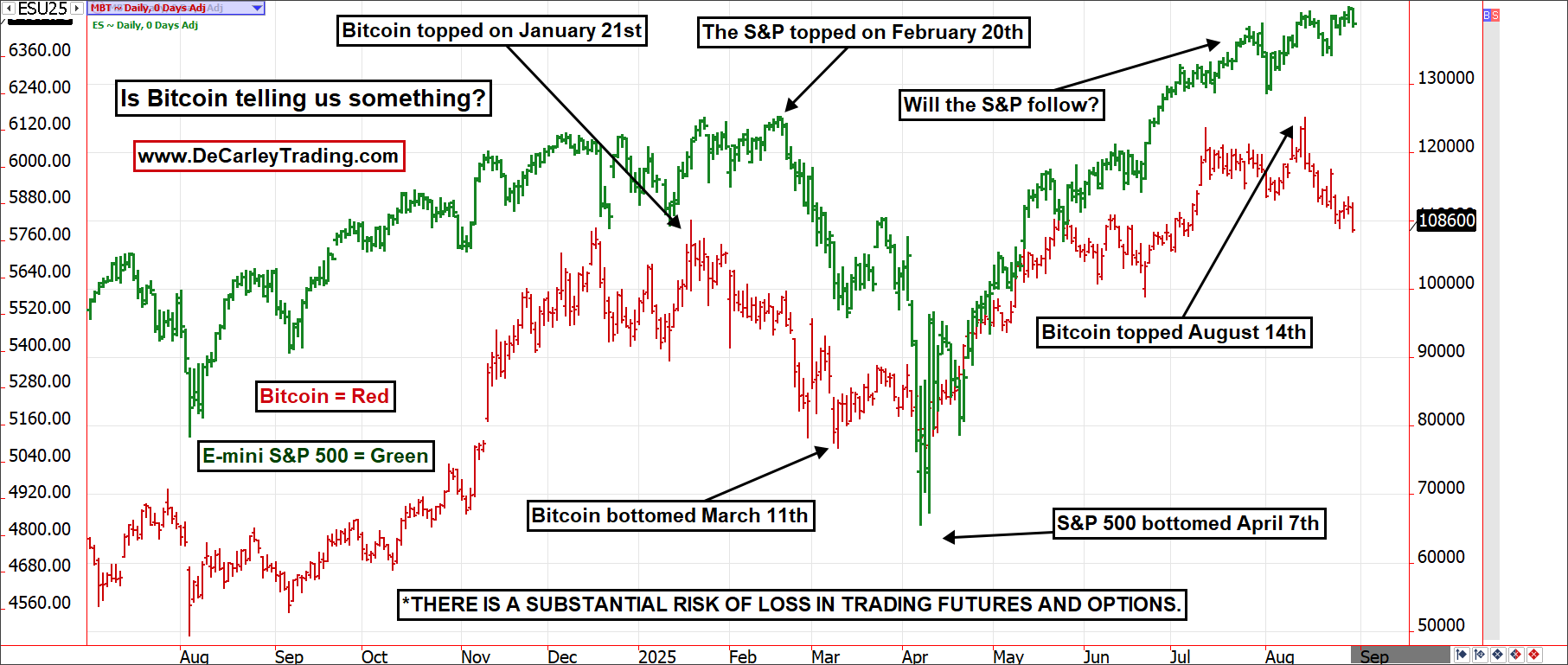 In early 2025, Bitcoin stopped making new highs on January 21 but the S&P 500 didn’t make its last new pre-correction high until February 20. Similarly, Bitcoin stopped making new lows on March 11, but the S&P made its last lower low on April 7. Bitcoin made its last high on August 14. If it can’t recover, it will likely pull the equity market with it.