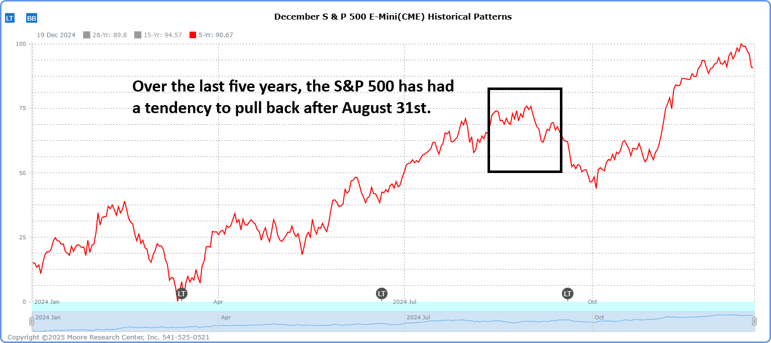 Finally, the December E-mini S&P 500 futures contract has been habitually pulling back on or around August 31 in recent years.
