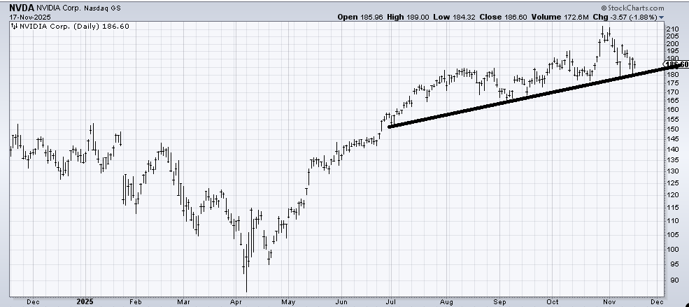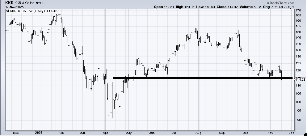 A few months ago, we looked at some of the asset manager charts like Blue Owl and (KKR) . Blue Owl has broken its April lows, but let’s check in on KKR because it is hanging by a thread. Thus far, it hasn’t cracked that low from Friday, November 7th, but it is threatening.