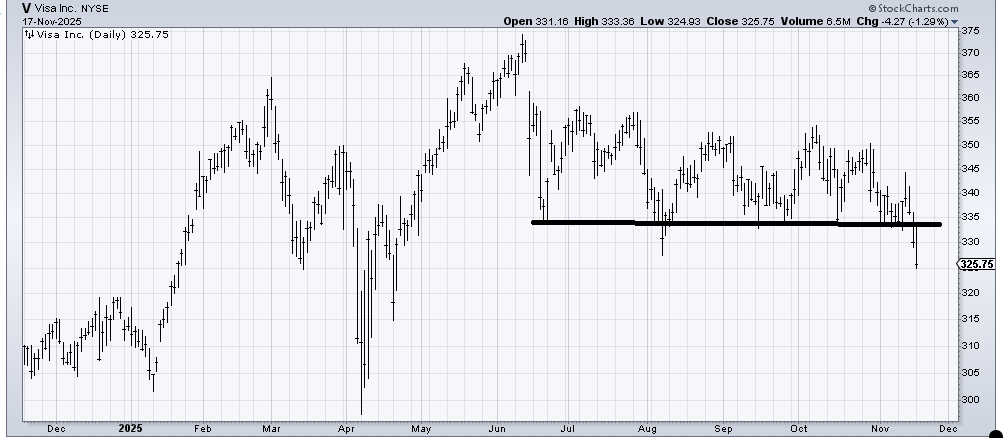 Recall, we looked at Visa around the same time. It kept holding that 335 area, but in the last few days, it has given way.