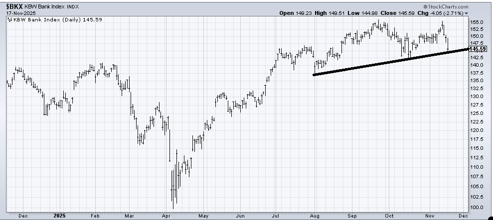 I see folks talking about the asset managers, but not much about the big banks. The Bank Index is at a support line. To me, these are the charts to watch.