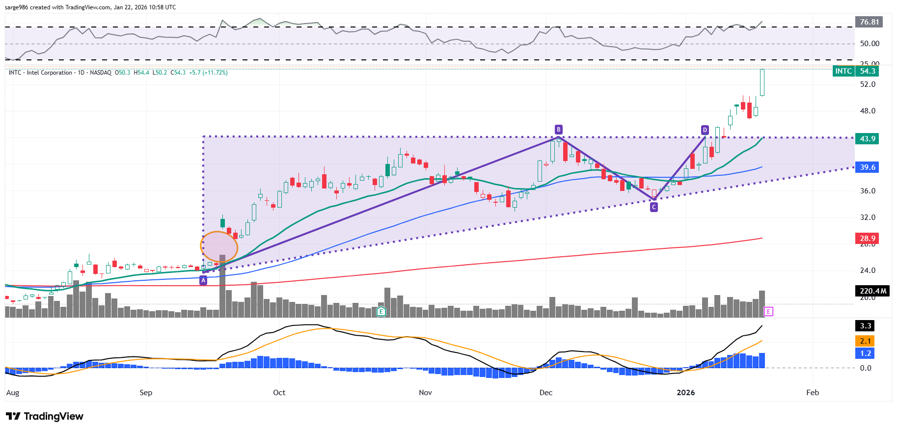 Readers may recall that on Jan. 8, with Intel trading at $41.60, I placed a $55 target price on the shares using a $44 pivot created by an Ascending Triangle pattern of bullish continuance. ​