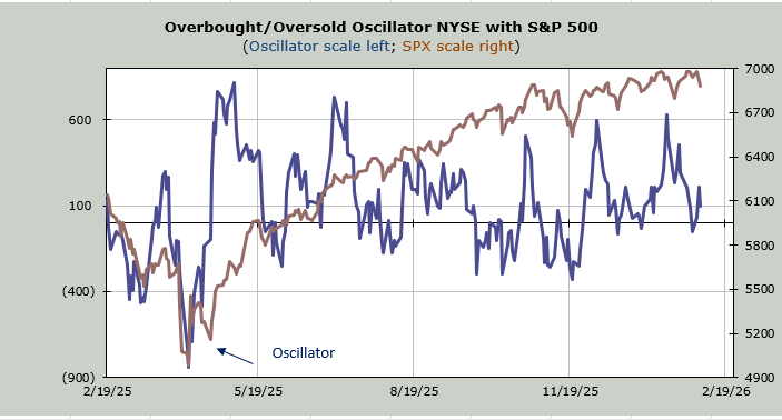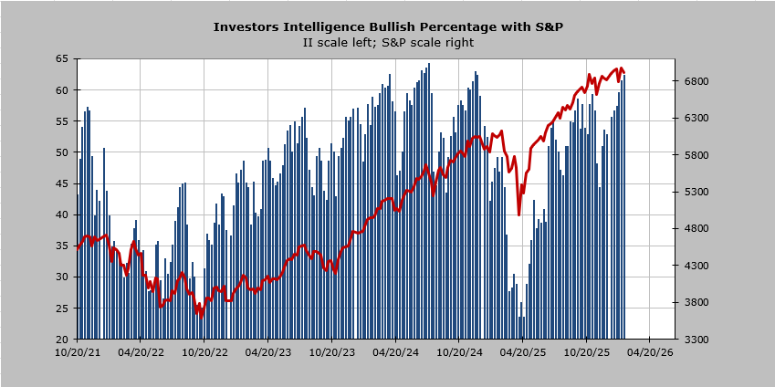 But now for some more news that is not terribly bullish for stocks. The Investors’ Intelligence Bulls jumped up to 62.3%. That’s pretty high. The last few readings in this neighborhood were 62.9% in December 2024, when the majority of stocks peaked; they were at 63.6% in July 2024, right before we saw a ten percent decline in the market over the ensuing few months, and 62.5% in April of 2024, which was when Silicon Valley Bank collapsed.