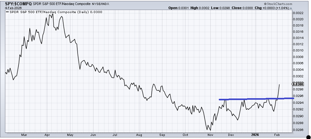 The other thing that changed this week is that the S&P started out performing Nasdaq by a wide margin and the ratio broke out to a higher high. Typically, when this happens, it is not bullish for stocks overall. What it tells us is that folks are opting for the more staid stocks of the S&P over the high beta of Nasdaq.