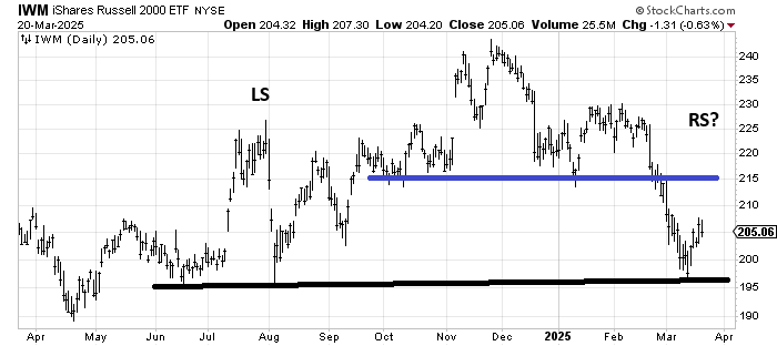 Speaking of the IWM/Russell, I was asked a few questions about the chart itself that I thought I would address today. Yesterday I noted there was resistance at 215. Someone asked why we couldn’t see a rally back to 225 to complete a head and shoulders top (drawn in black).