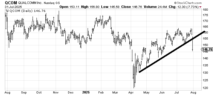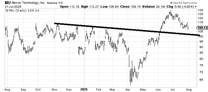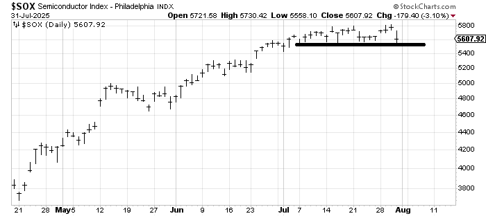 Micron Technology MU is number six on the SOX list and it was down 15% in the month of July. The good news is, like Netflix NFLX, it has not gapped down, it has just been a steady decline. The other good news is that it is coming into support. But basically three stocks are holding up the index.