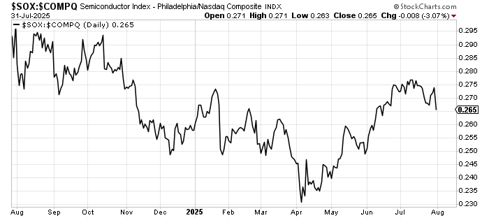 But once again it is the chart of the SOX that has my attention. The semis are supposed to be the leaders. They certainly have had one heckuva run since April. More than I thought they could. But look below at the SOX relative to Nasdaq. It never even got close to the highs from a year ago. It barely got over the January high (the ratio). And now the ratio is lower than it was as we entered the month of July.