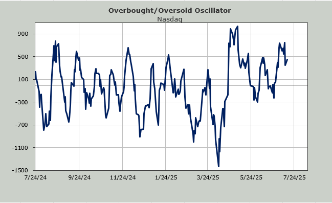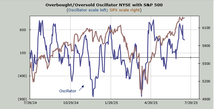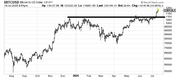 On television I think every single guest was asked about the breakout in Bitcoin. I rarely comment on Bitcoin, but let me say that the breakout last week has a short-term measured target around $120,000 (longer term is higher). I only tell you this because the Daily Sentiment Indicator (DSI) for Bitcoin chimed in at 83 on Monday. So if there is a frenzy over this being Crypto Week, that DSI should be on your radar.
