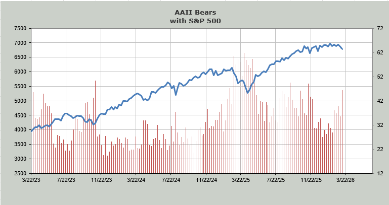 The AAII folks joined the Investors’ Intelligence folks (shown here yesterday) in pulling back their horns. Similar to the II folks, the AAII bulls stayed mostly steady, but the bears shot up. In this case, it was eleven points. It is not extreme, but it is moving in that direction with 46% bears now.