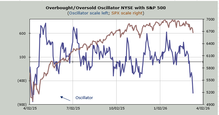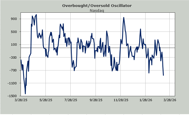 Many of you will see the Overbought/Oversold Oscillator nearing the April 2025 lows and say this is oversold. It is getting there. Remember that I look back ten days (this is a ten-day moving average of the net of the advance/decline line) to see when we are dropping a long string of negative breadth readings. The last six trading days’ breadth has been red. And for seven out of eight, it has been red. That means next week we’ll be short-term oversold.