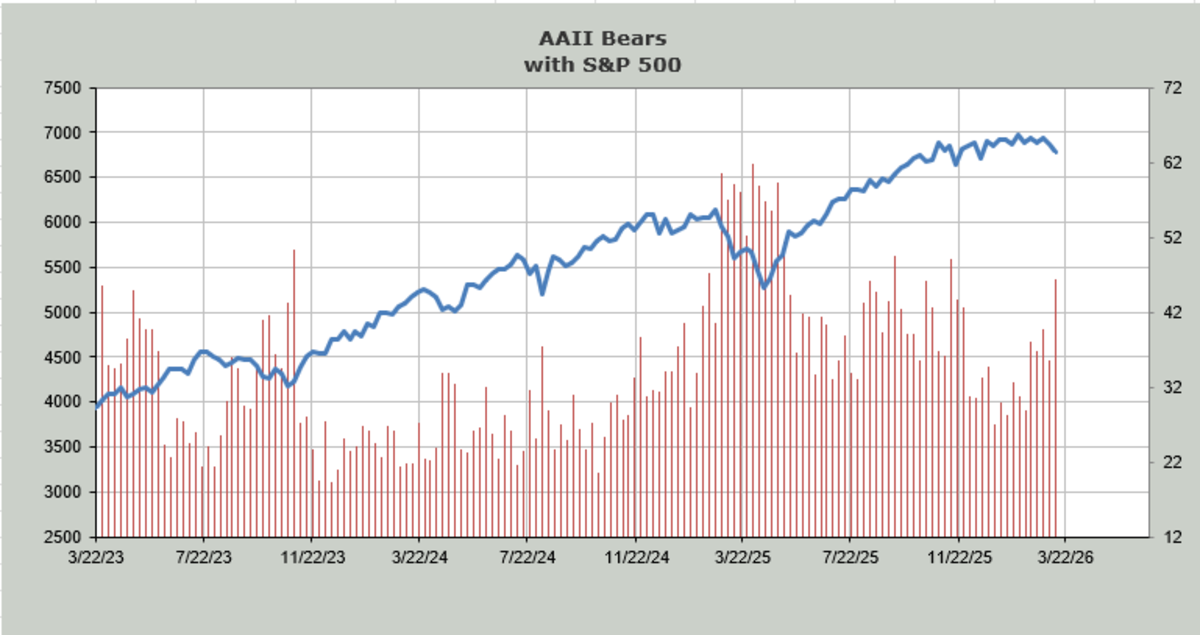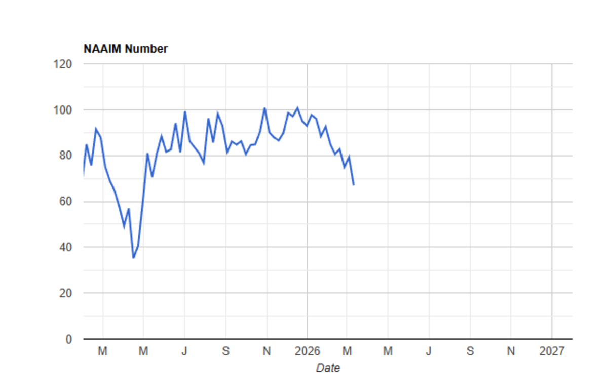 The NAAIM folks, too, pulled in their bullish horns. In December, their exposure was just a smidge over 100 (on margin). Now it’s down to 67, which is the lowest since the panic low of April 2025. Again, not extreme, but finally some movement off that complacency we were in for so long.