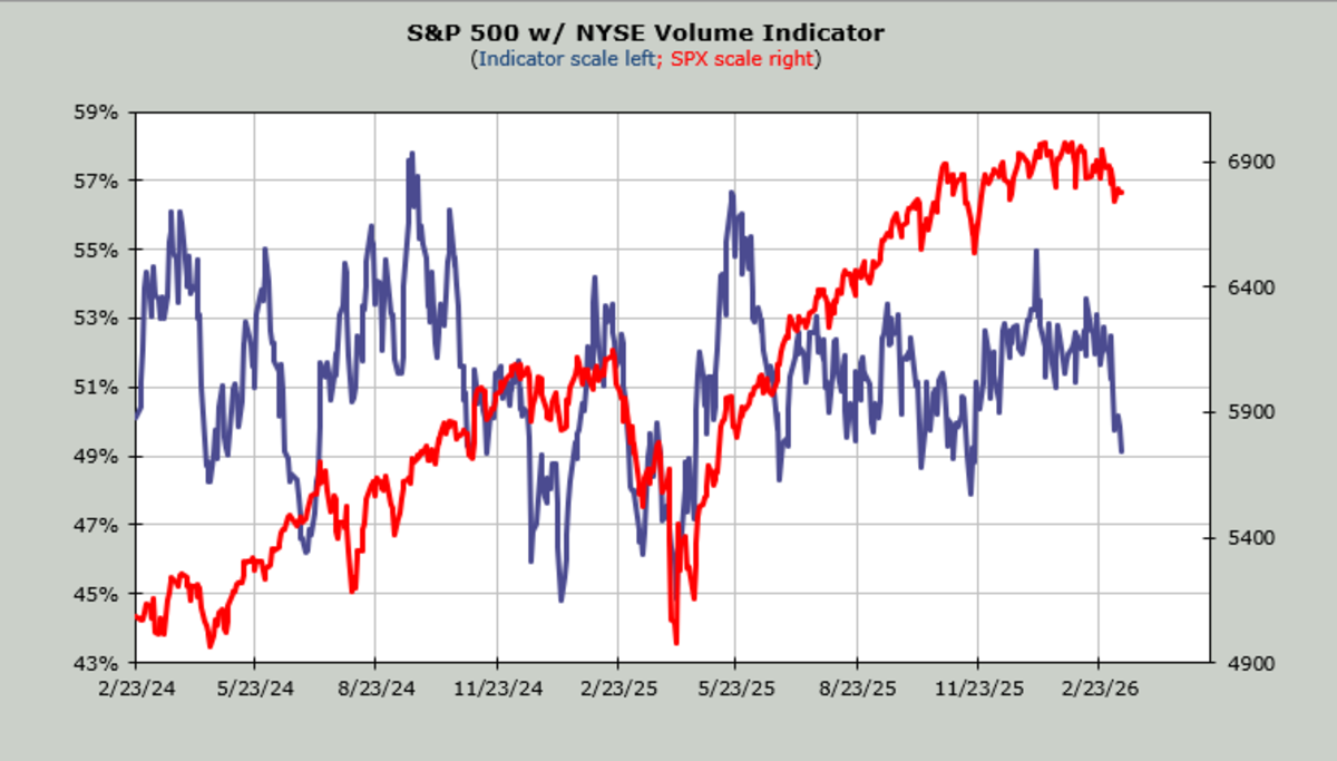 The intermediate-term indicators are not oversold. They are heading that way. For example, the Volume Indicator is at 49%. In bull markets, it gets oversold at 47%. In bear markets, it comes down to the low 40s.