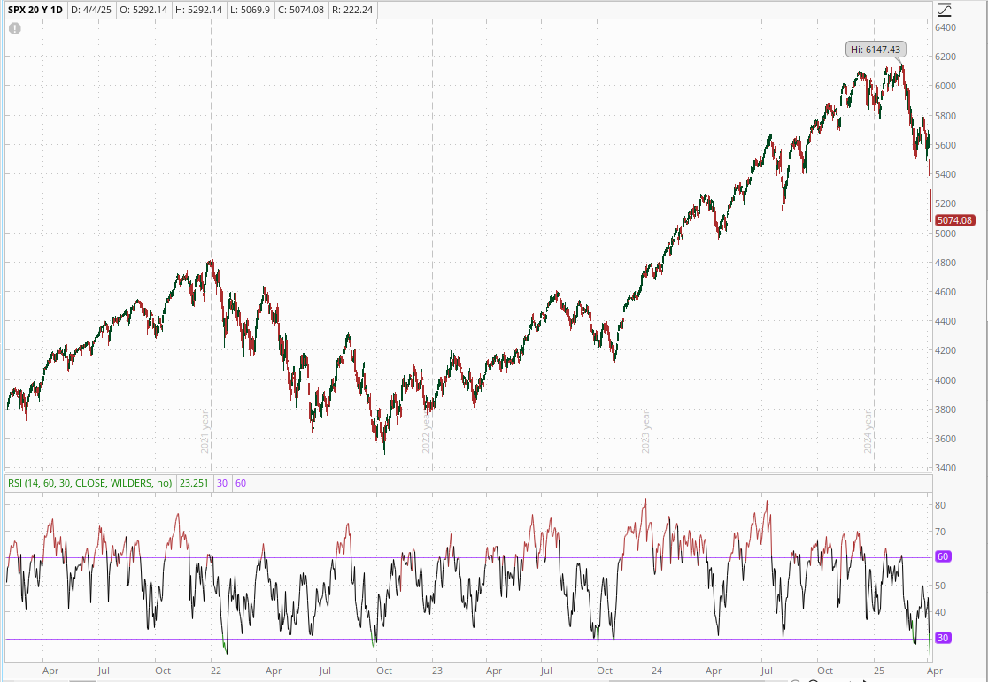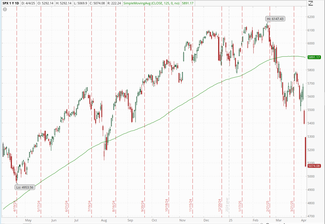 The S&P 500 closed at 5074 today, which is 17.5% off of the all-time high set in February. 5074 is also 817 points below the 125-day moving average. That is a lot. Like 14% below. Or 5 standard deviations.
