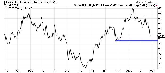 But that brings us to the bonds. All of a sudden—anecdotally—I can’t find a bear on bonds. In the short term, we are closing in on the December low in rates, and with an inflation reading coming out on Friday, I’d be inclined to look for a bounce in rates.
