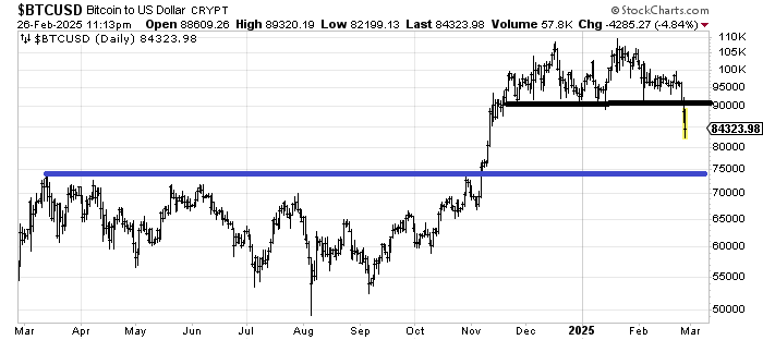 This brings us to Bitcoin. If you couldn’t tell from my columns all these months where I call it crypto garbage, I am not a fan. The only use case I see is for illegal activities, so you’ll color me skeptical. But several have inquired regarding the chart because it has finally broken 90,000. The textbooks would say it’s a double top, and if we take the top of the pattern (call it 105k) and subtract the bottom (90k), we get 15k. We then subtract that from the breakdown at 90k, and we get 75k, and yes, I know that’s where support is. Like magic!