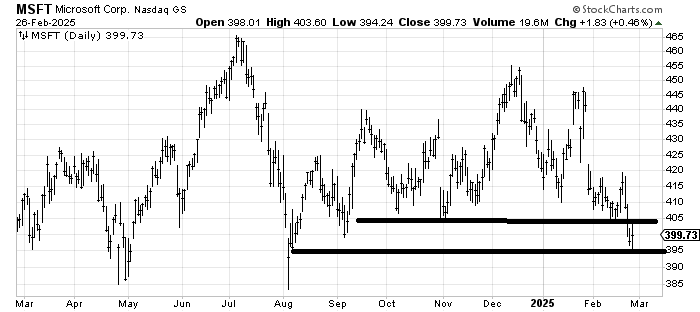 The only chart that broke was Microsoft MSFT, and it didn’t even whoosh. It dribbled. If it trades back over 405, it’s going to be just like ITB, which broke 100, traded down to 97, and then recaptured 100. Let’s call this chop with a downward bias.