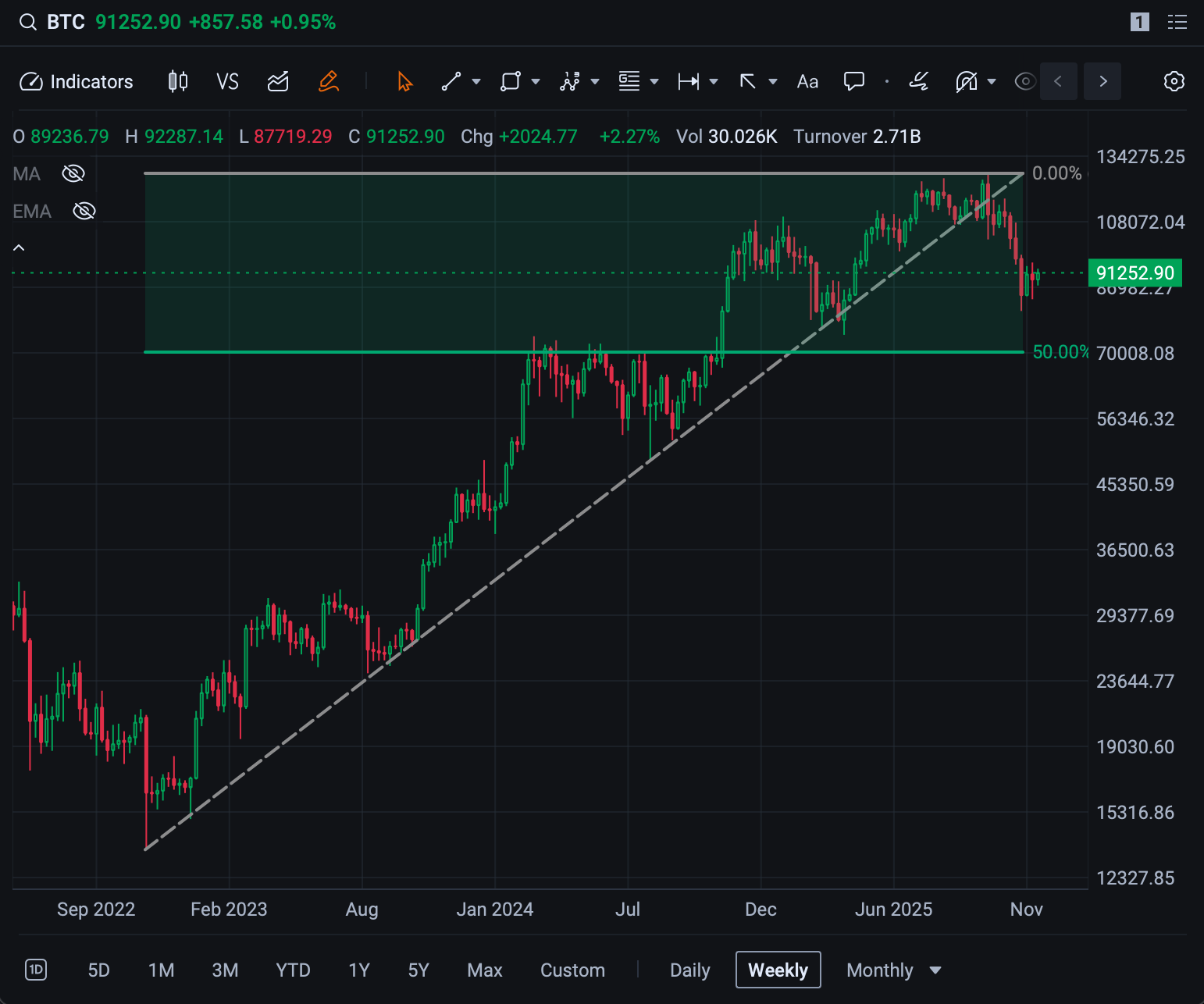 On the upside, $100,000 is the obvious psychological hurdle, but the spot that should attract real supply is near $103,450, which is the halfway point of the drop from above $126,000. If price can’t chew through that, sellers will keep leaning into strength, and Tom Lee’s gazillion-dollar price targets will have to wait.