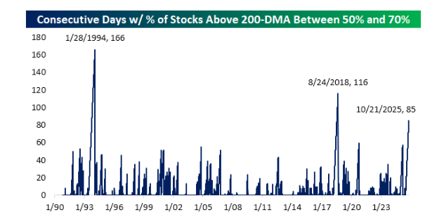 Bespoke tracks the number of consecutive days that the percentage of stocks trading over their 200-day moving average lines has been between 50% and 70%. This is not an indicator I use, but basically, call that neutral territory: not overbought/not oversold.