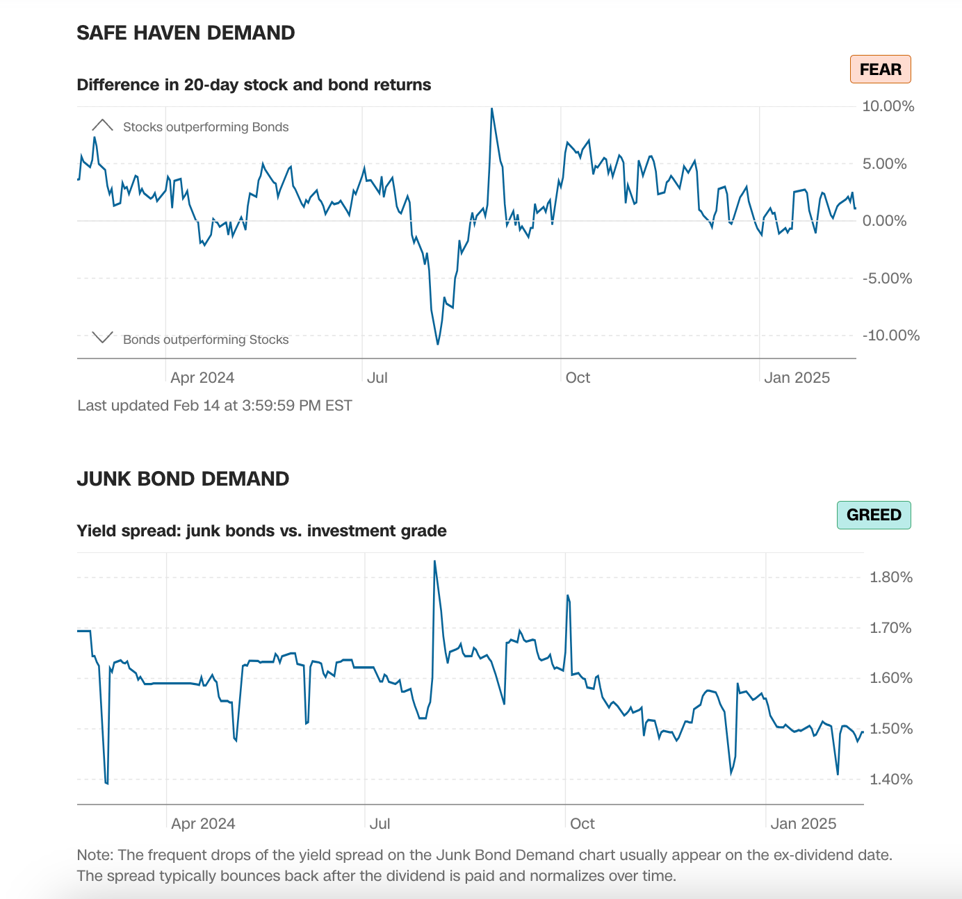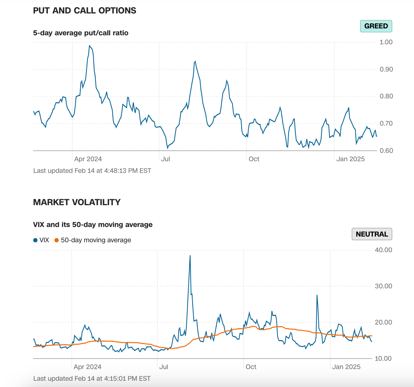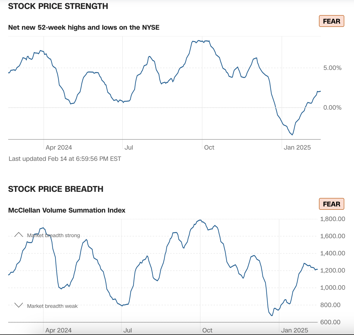 That dip was driven by breadth, which has recovered a bit, but not enough to suggest broad strength in the market. Both indicators remain locked in the Fear zone, though a couple of strong days would turn both positive.