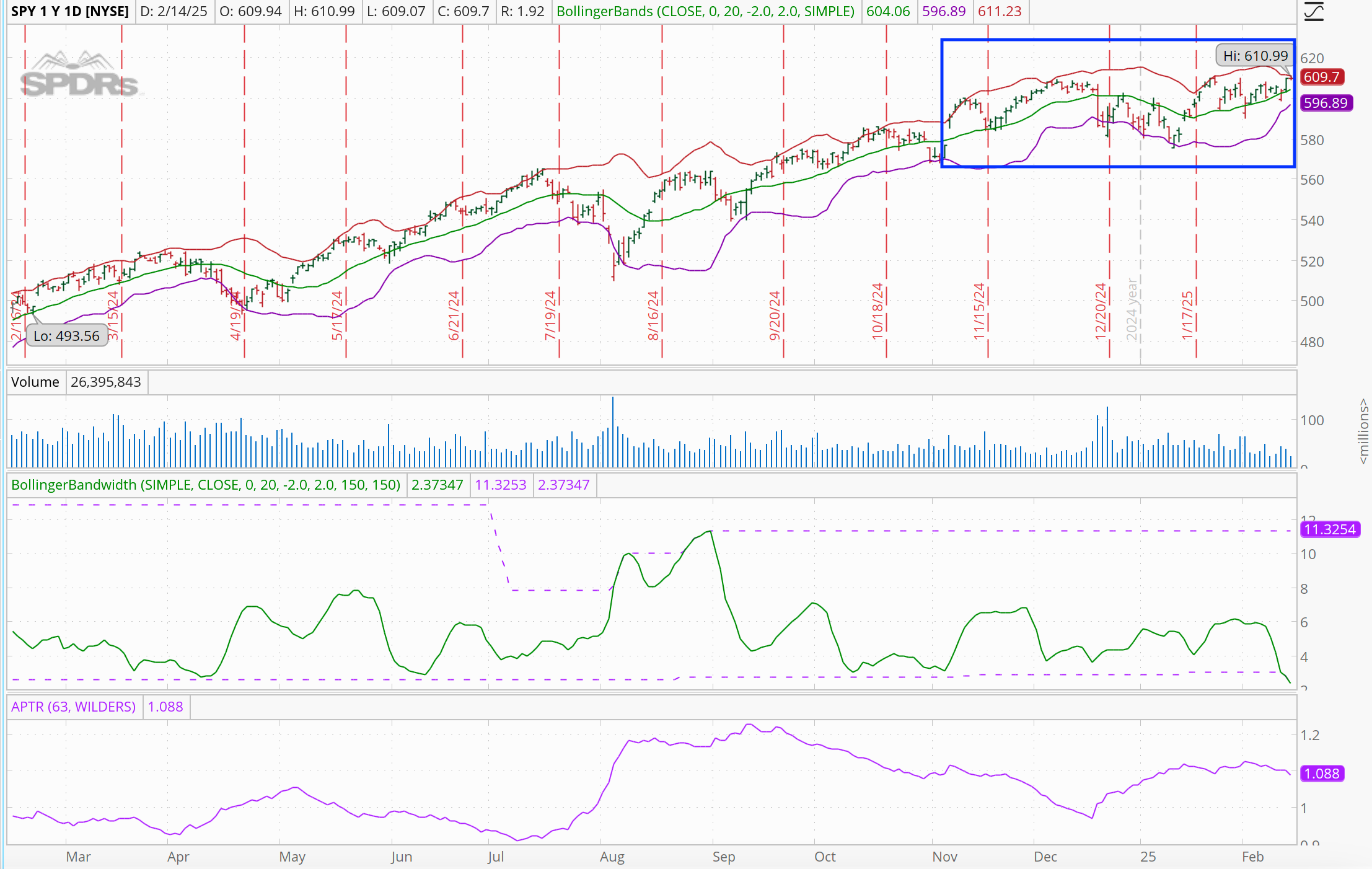 The market has been choppy during this period, and daily volatility, measured by the Average Percentage True Range (in purple), is elevated.